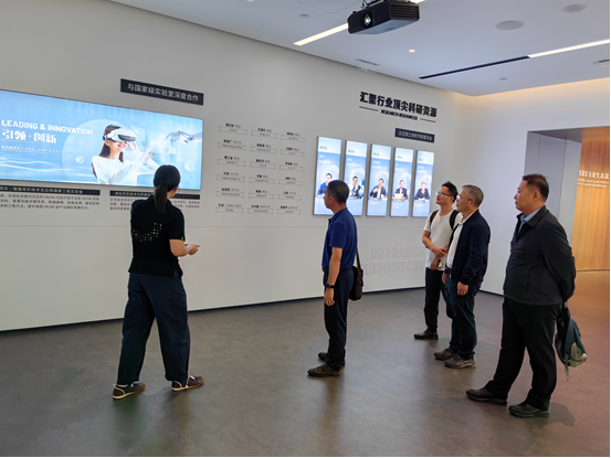 活动的第一部分是参观调研国家虚拟现实创新中心。与会人员详细了解了中心在虚拟现实技术研发、创新应用等方面的最新成果及发展规划。接着,严小天总经理介绍了国创中心的主要情况,强调了虚拟现实产业未来的巨大潜力和技术前沿。李晓波副总经理则分享了虚拟现实技术在各行业的应用前景,并展示了中心在推动虚拟现实产业创新方面的成就。随后,365英国上市公司官网智能学院的马礼书记代表学院介绍了在虚拟现实领域的教学和科研进展,展示了学院在数字媒体技术和虚拟现实技术融合方面的最新成果。